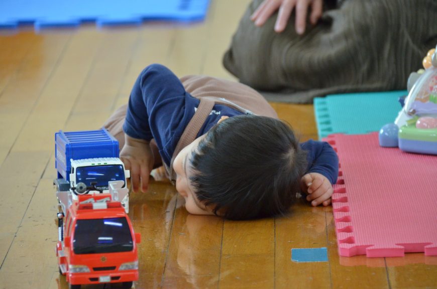 えっくんは乗り物好き。特にトラックやバスが好きだそうな。しかもタイヤの接地面に興味があるため、御覧の通り、はいつくばって眺めています。