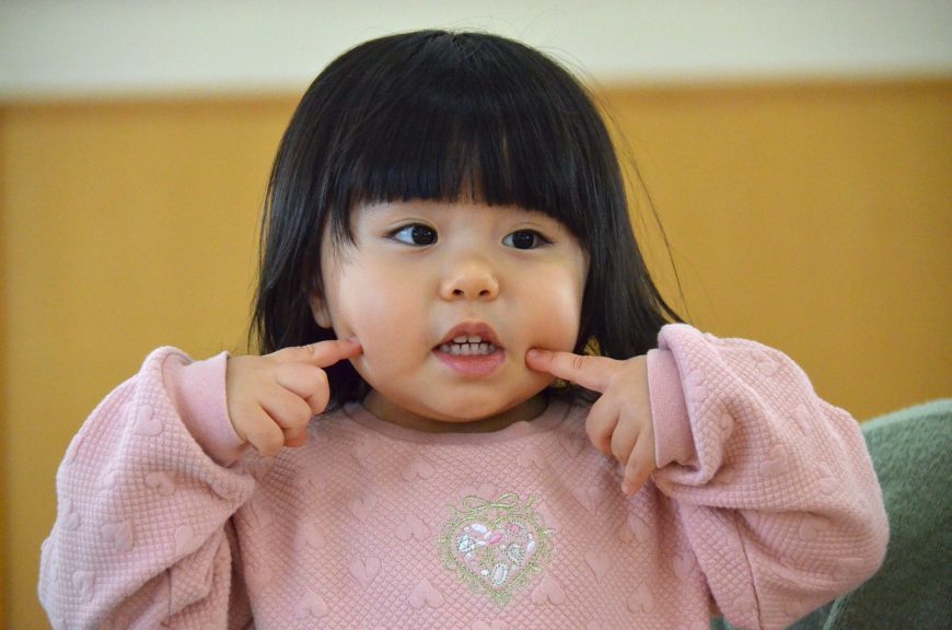 めいちゃんの得意なポーズは、指でほっぺを押さえるこれだそうです。