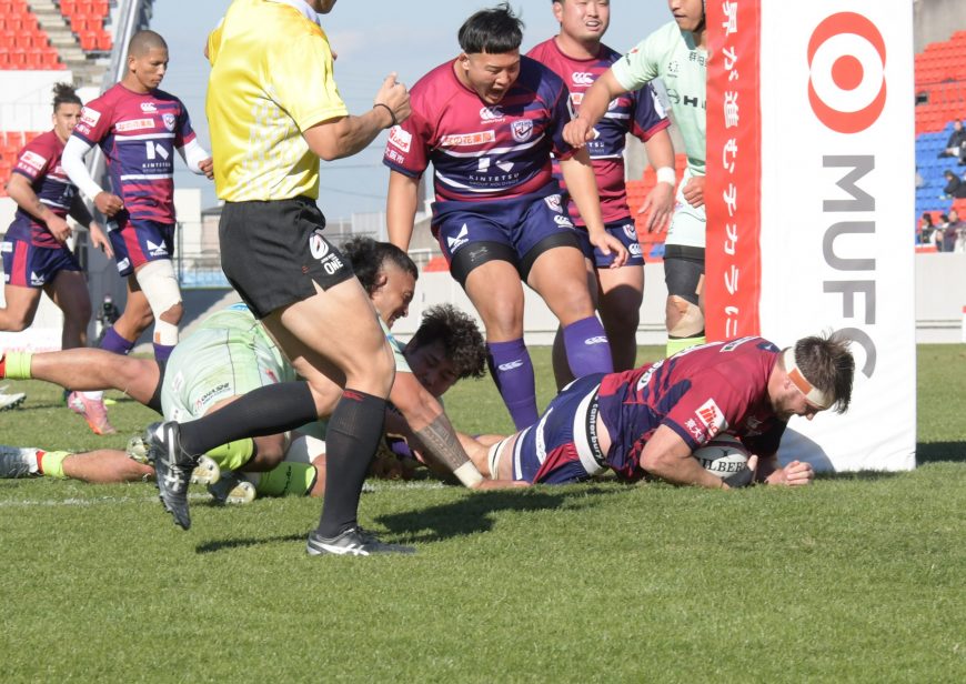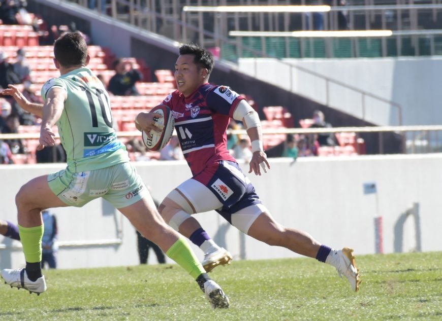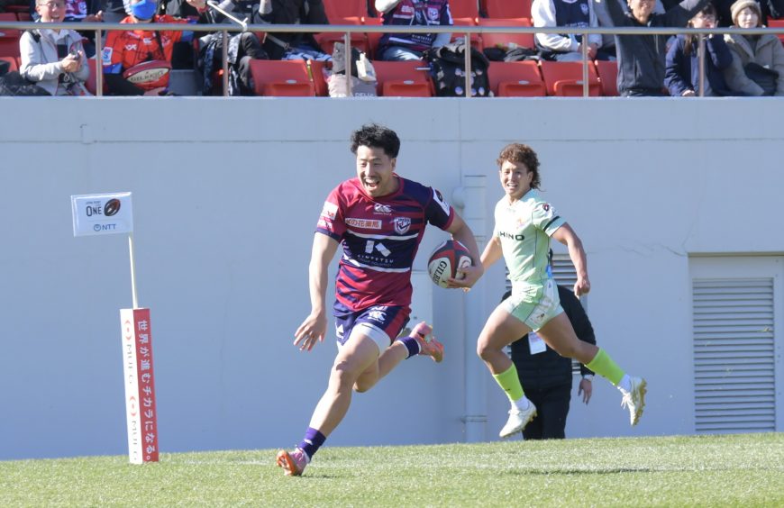 近鉄が接戦を制して逆転で日野ドルフィンズを突き放して3連勝を飾った。点の取り合いとなったこの試合で後半18分、SH河村 謙尚(9)は逆転につながるトライを奪う。
